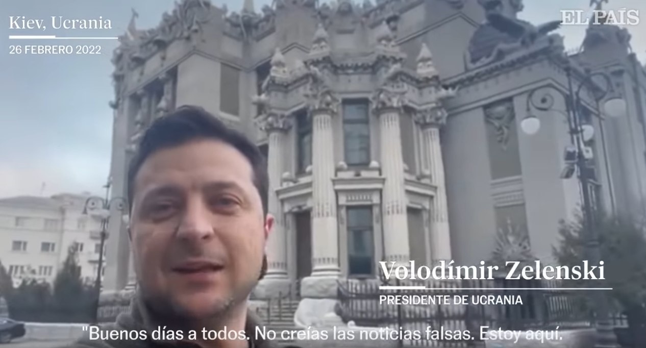 Zelenski se graba a sí mismo primero en traje y luego con ropa militar, sonriendo y delante de un edificio emblemático que los ucranianos conocen bien -para que sepan que no está en el extranjero o a salvo en algún lugar secreto-. O, también, se graba de noche en la calle rodeado de colaboradores, como si estuviera de cañas con unos amigos. No disimula, no elude lo que está pasando -quién podría-, simplemente da a entender de manera inconfundible que está aguantando el tipo.